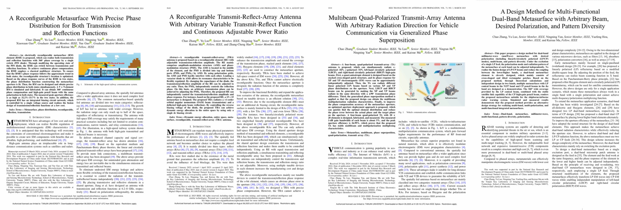 无码av “互联感知集成电路与系统”实验室隶属于无码av-成人影院-成人视频 ,由IEEE Fellow、“国家杰出青年科学基金”获得者、中国电子学会会士马凯学教授依托天津市成像与感知微电子技术重点实验室牵头成立,主要开展微波毫米波通信与成像集成电路、基于ISL平台系统集成技术、无线通信系统天线设计,以及人工智能射频EDA技术研究。团队坚持“四个面向”开展科技创新,在上述领域牵头承担国家重大专项1项、国家重点研发专项2项、青年项目1项、国家杰出青年科学基金1项、国家重点基金项目3项和其他多项课题。团队成员罗宇教授专注于新一代移动通信系统中的天线研究,发表SCI期刊论文100余篇,其中在天线领域国际顶级刊物IEEE Transactions on Antennas and Propagation (IEEE TAP)发表38篇论文,主持国家重点研发计划课题等项目。2023年获得高等教育 (研究生)国家级教学成果奖二等奖(10/15),获得2023年国际应用计算电磁学会(ACES)青年科学家奖,2023至2025连续三年入选全球前2%顶尖科学家榜单。