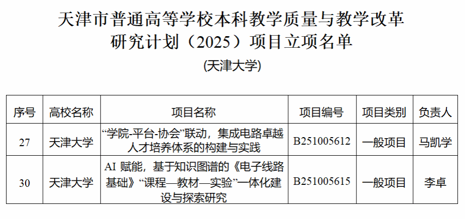 本站讯(通讯员:石惠)近日,天津市教育委员会相继发布首批天津市级普通高校新形态教材建设项目及2025年天津市本科教学质量与教学改革研究计划项目立项名单,无码av 申报的4个项目全部获批立项,其中《系统级芯片(SoC)设计》《电子线路基础》获批新形态教材建设立项、《“无码av -平台-协会”联动,集成电路卓越人才培养体系的构建与实践》《AI赋能,基于知识图谱的〈电子线路基础〉“课程—教材—实验”一体化建设与探索研究》获批本科教育教学改革项目立项。